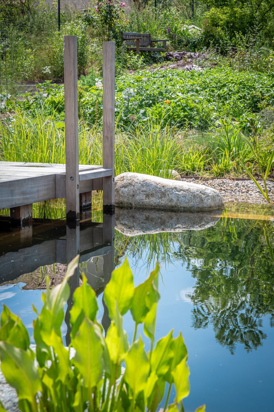 Konstrukce plavací části, podoby mělčin, materiálové řešení okrajů, jezírko ve svahu, dřevěné konstrukce: molo, schůdky, žebřík, výdřeva, designové vodní prvky. - Jezírko v zahradě jako doma: Propojení vody, rostlin a prostoru